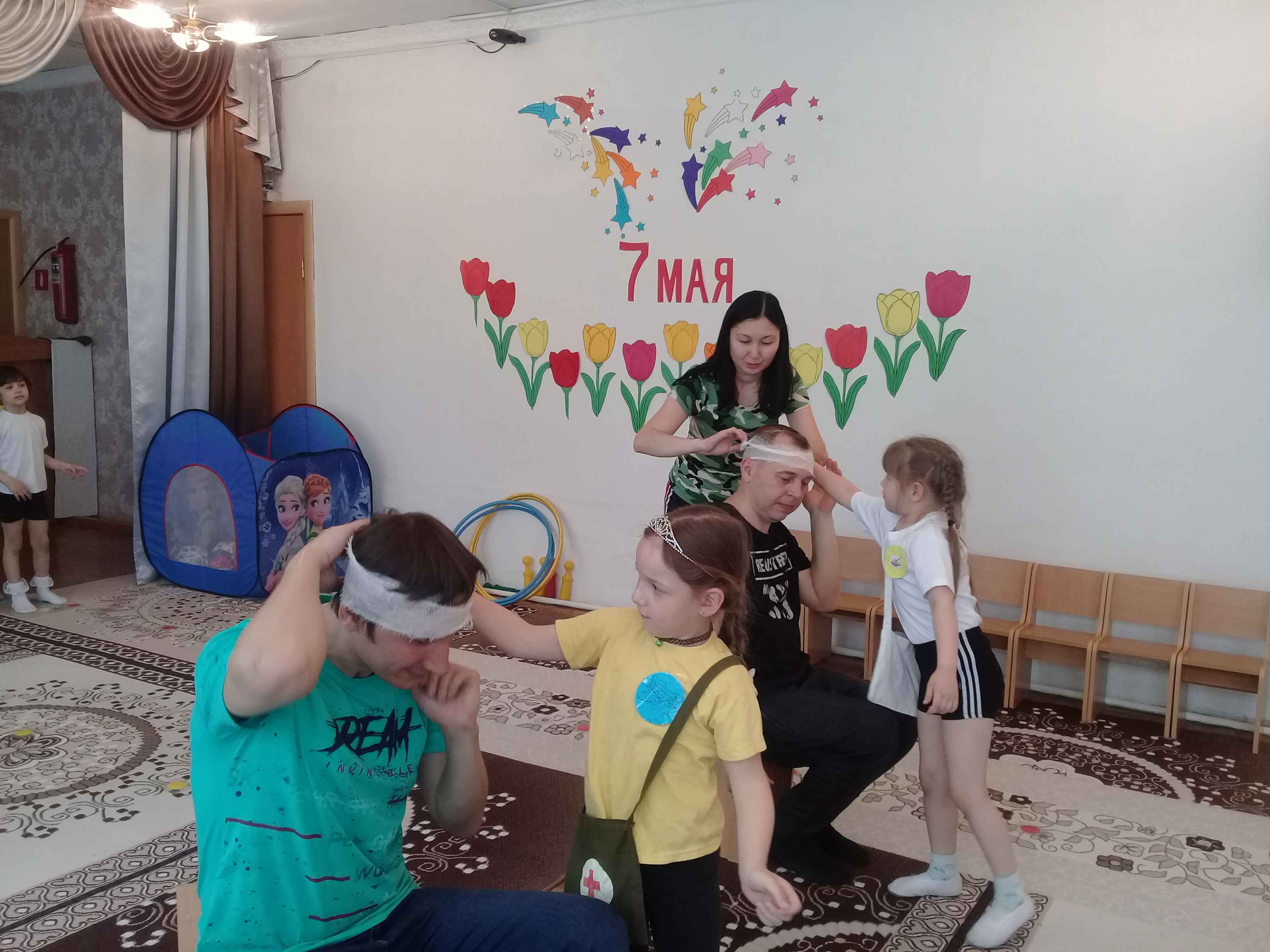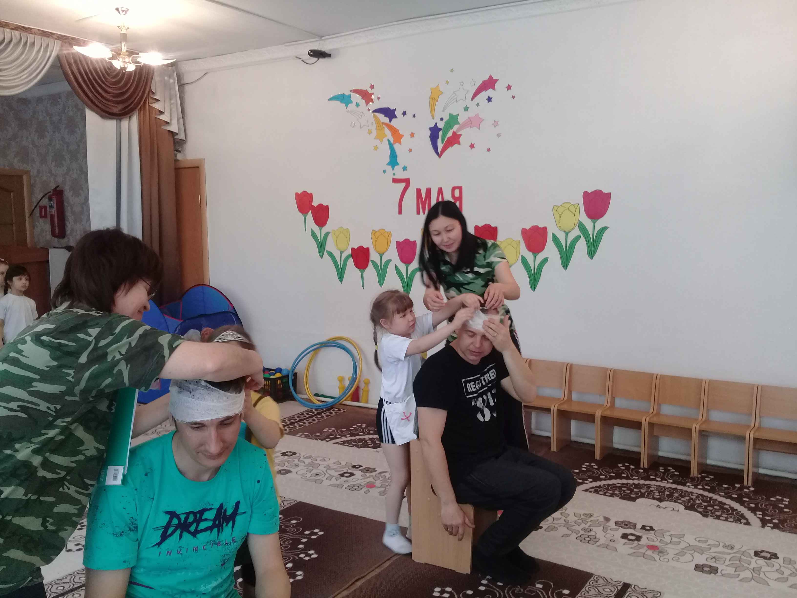 Участвовали команды средних и старших групп совместно с родителями. Проводились не только разнообразные спортивные конкурсы но и конкурсы интеллектуального характера, в промежутках между эстафетами были исполнены музыкальные поздравления в виде стихотворений, песен, танцев на военную тематику. Девочки попробовали себя в качестве военной медицинской сестры- оказывали первую медицинскую помощь раненым бойцам. Каждый конкурс оценивало жюри. В заключении соревнования были подведены итоги. Победители были награждены грамотами. Дети и родители получили массу удовольствий и положительных эмоций.
