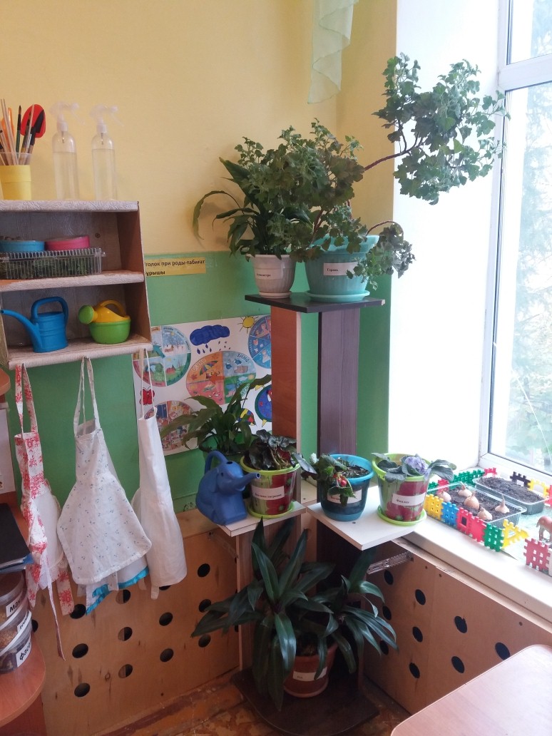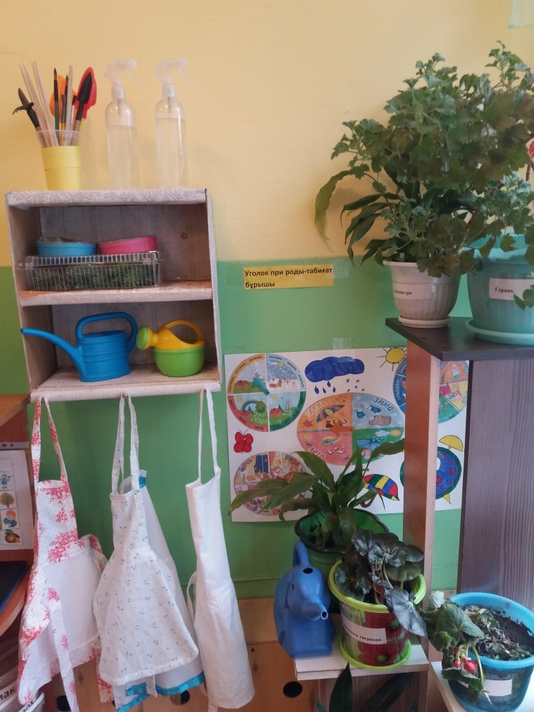 МДҰ топтарында" Табиғат бұрыштары " ұйымдастырылған, эстетикалық безендірілген, балалар үшін қолжетімді жерде орналасқан, онда белгіленген тақырып бойынша көркем және энциклопедиялық әдебиет, экологиялық сипаттағы дидактикалық ойындар, еңбек қызметіне арналған құралдар бар, эксперименталды процесінде балалардың танымдық белсенділігін дамыту үшін барынша жағдай жасалған, еңбек үшін материалдар мен құралдар жүйелендірілген, санитарлық-гигиеналық талаптарға сәйкес табиғи материалдан жасалған бұйымдар дайындауға арналған табиғи материал іріктелген., тақырыбы бойынша дидактикалық және көрнекі материалдар бар, "Көкөністер мен жемістер" альбомдары ресімделді, Табиғаттағы маусымдық құбылыстарды, ұшып келетін құстарды бақылау күнделіктері жүргізілуде.